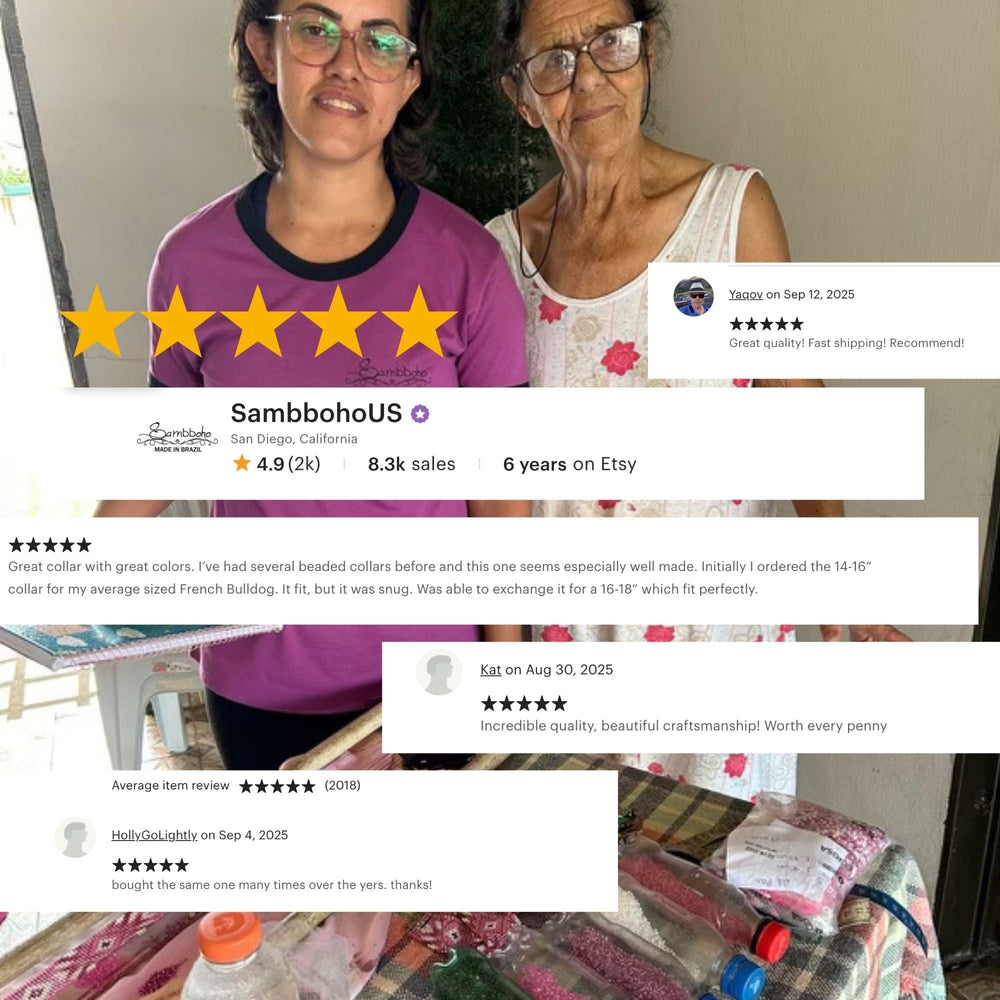 Sambboho is known for its handmade full-grain leather beaded dog collars, crafted by women artisans in Brazil. Every collar is made with luxury-grade materials and authentic craftsmanship—not mass-produced, not generic, and not white-label.